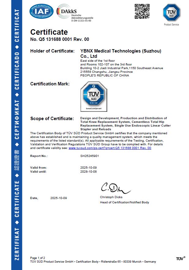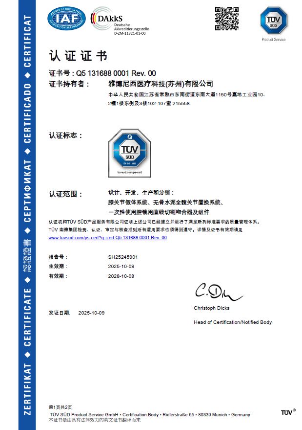 ISO 13485是医疗器械行业公认的质量管理标准,此次认证通过,意味着雅博尼西医疗在膝关节假体系统、无骨水泥全髋关节置换系统、一次性使用腔镜用直线切割吻合器及组件的设计、开发、生产和分销中均建立并实施了高标准的质量管理体系,为客户提供更安全、更可靠的医疗产品与服务。